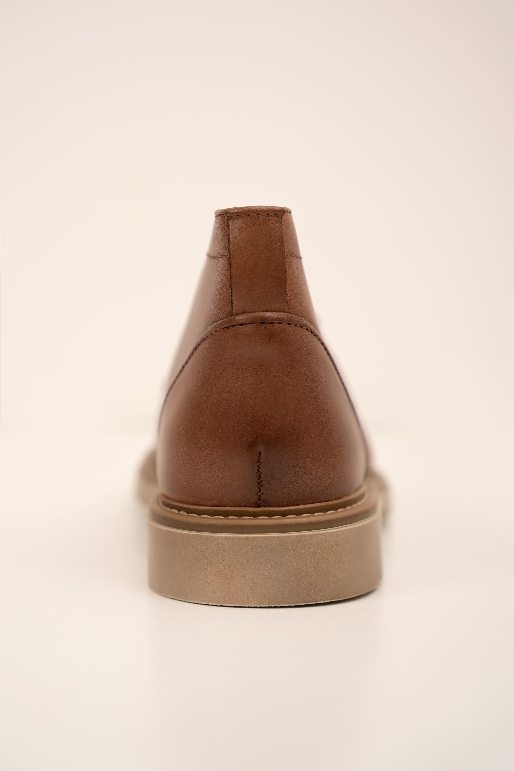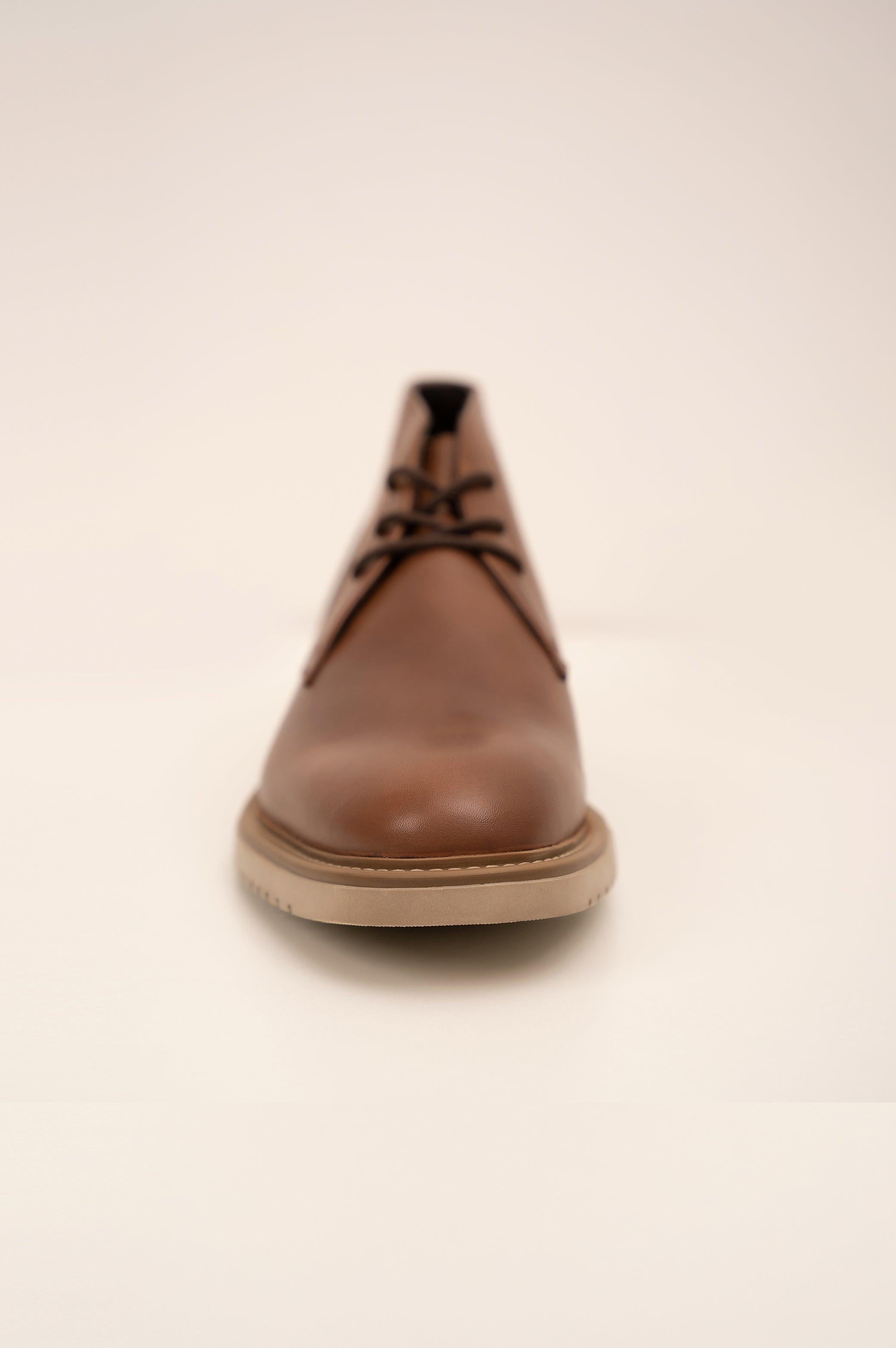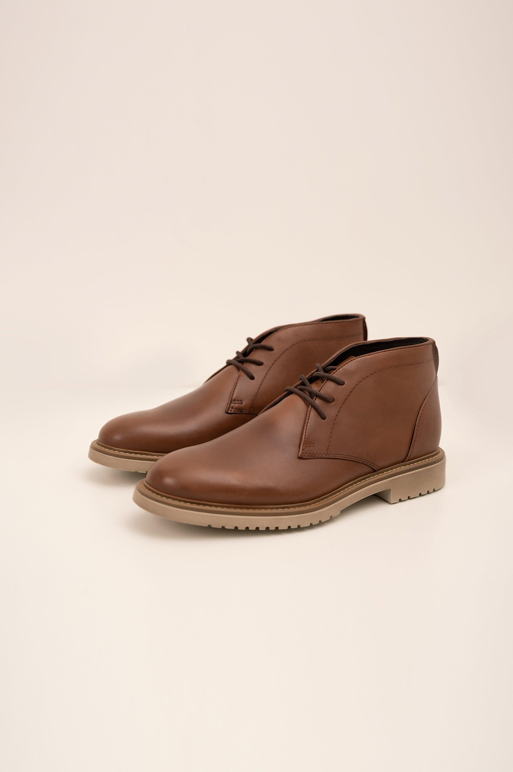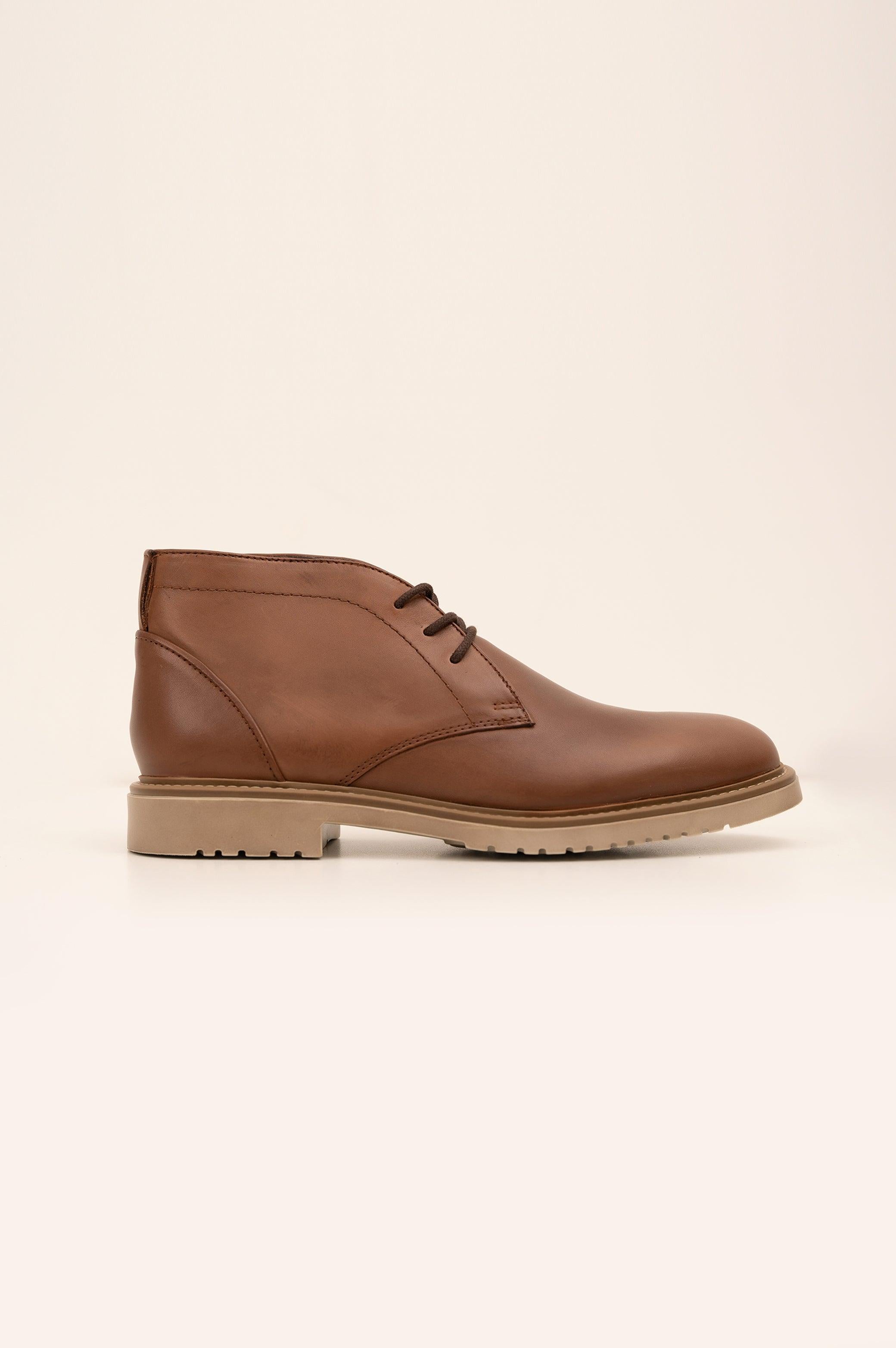 Desert ankle high leather boot.- Round toe- Contrast panel stitching- Lace-ups- Material: 100% ethically sourced genuine leather and soft rubber outsole