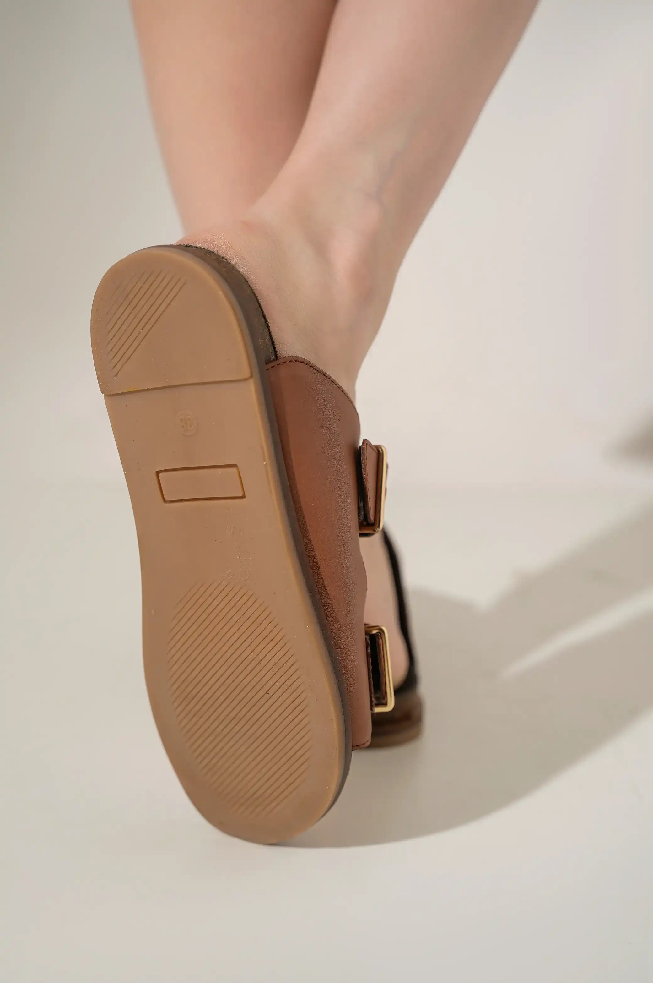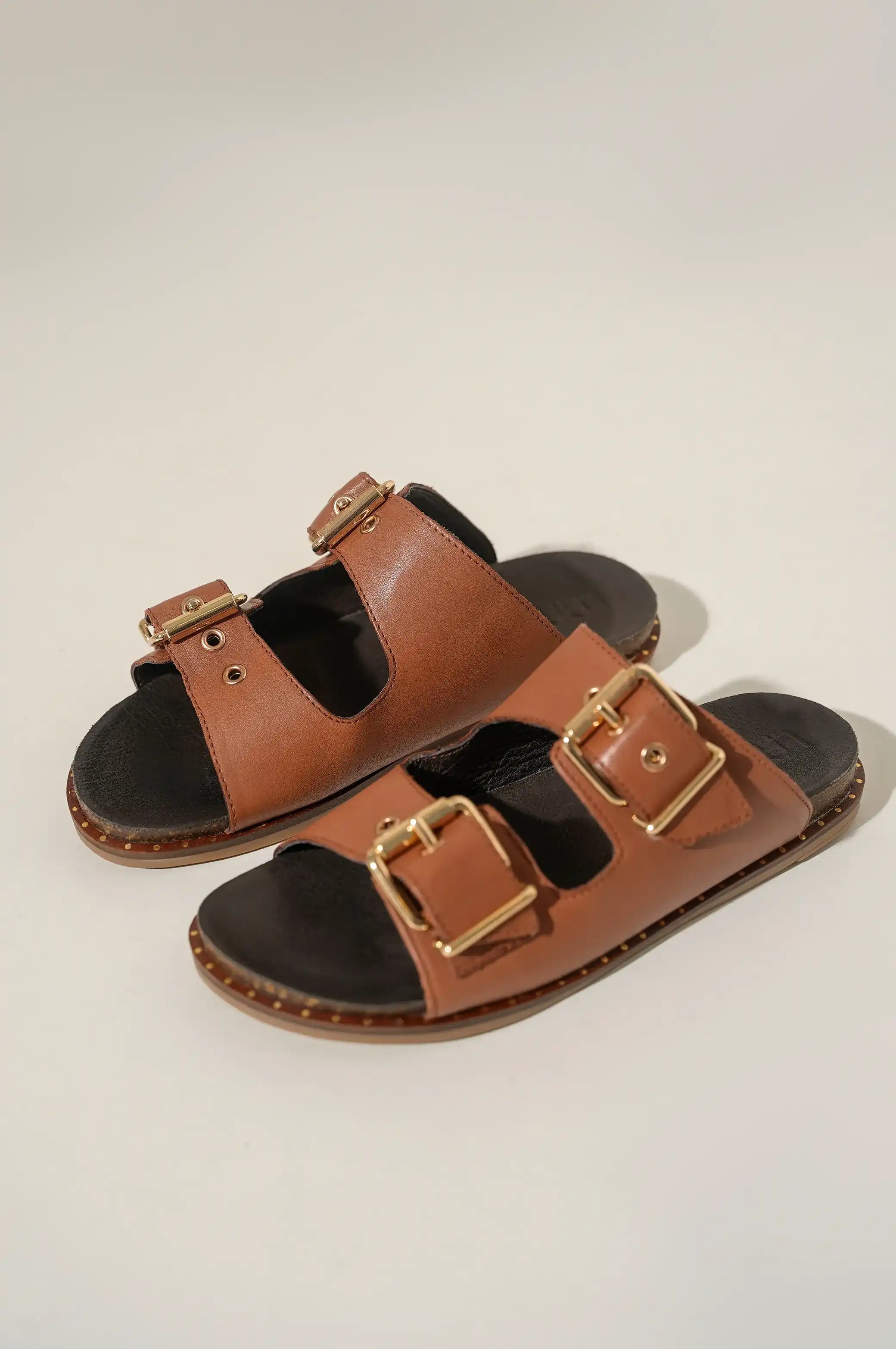 BUCKLED LEATHER SLIDES