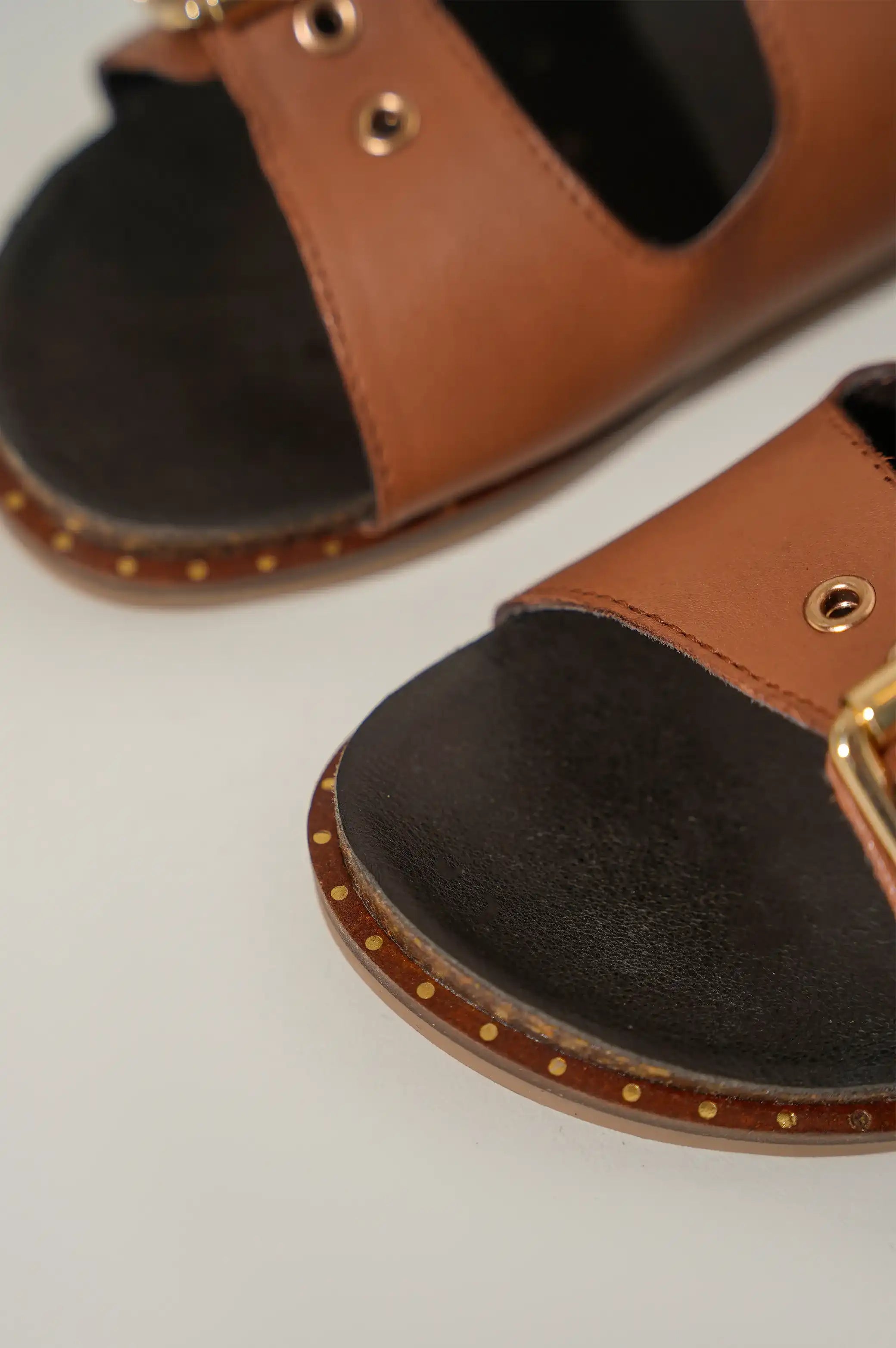 Tan buckled leather slides