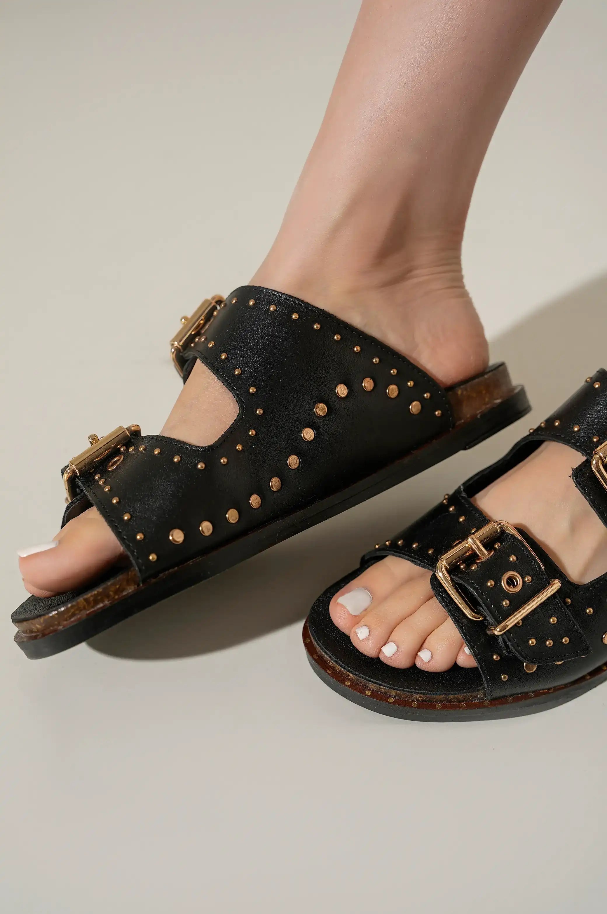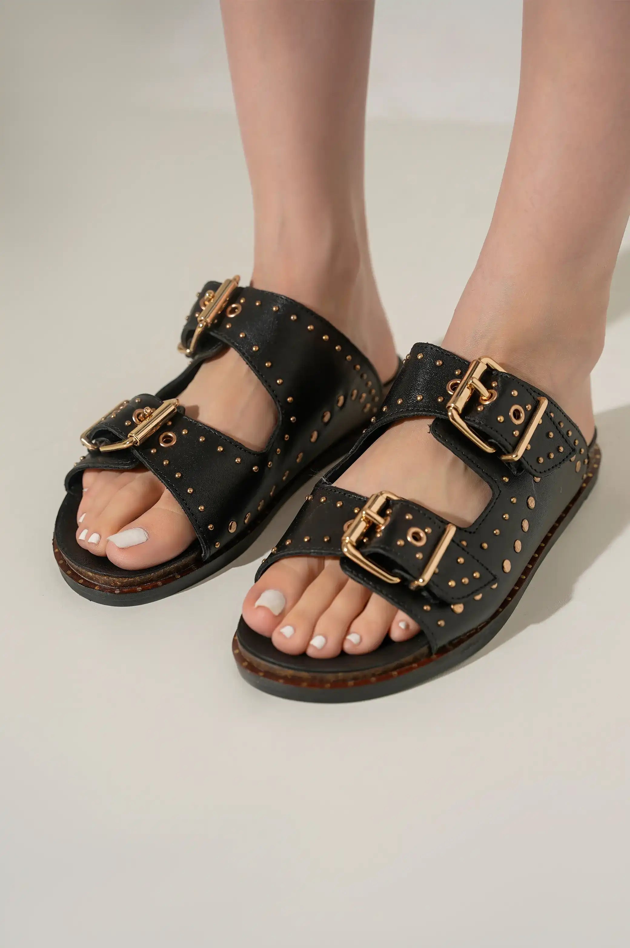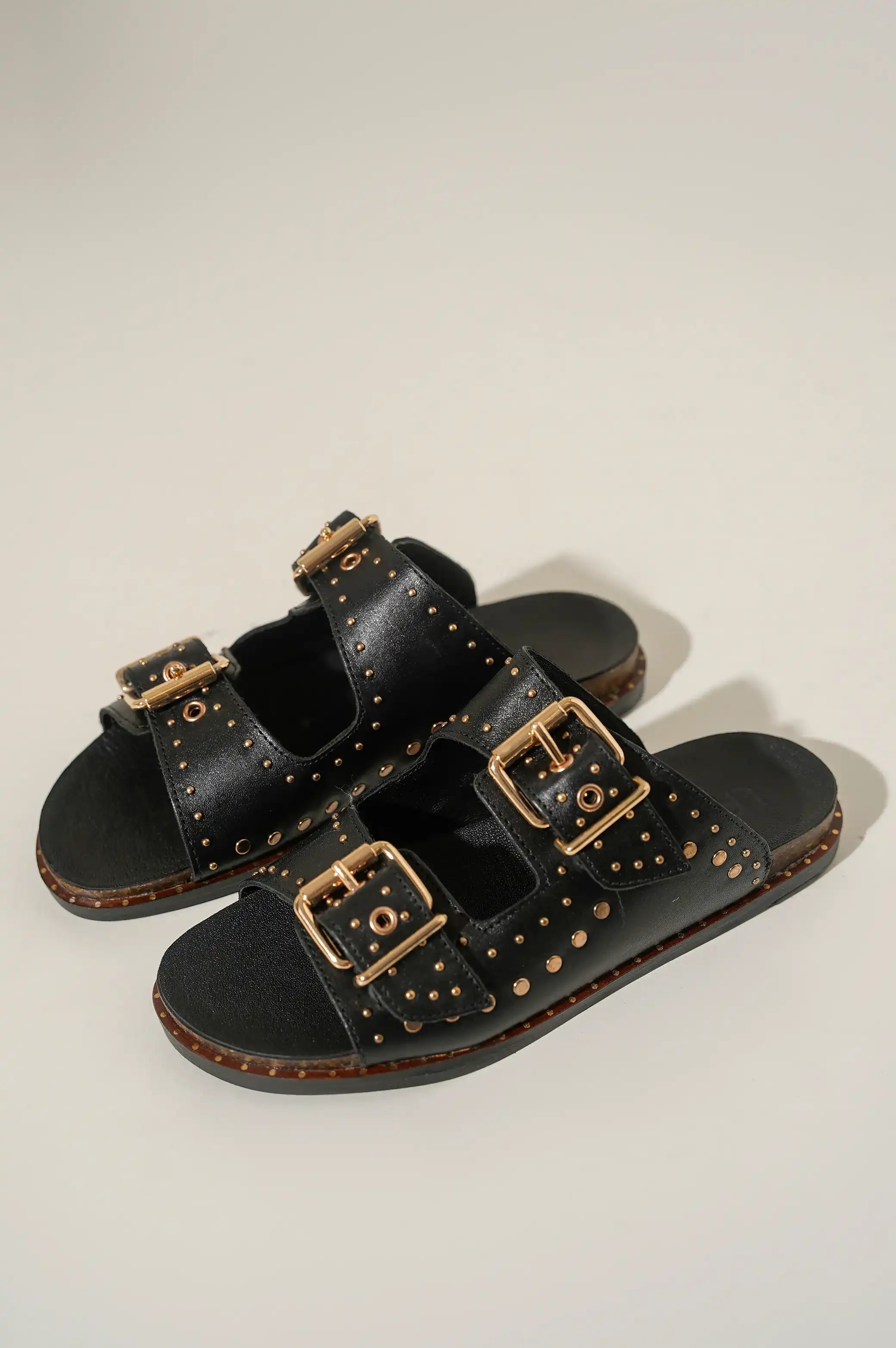 Comfy studded leather slides with double buckle.