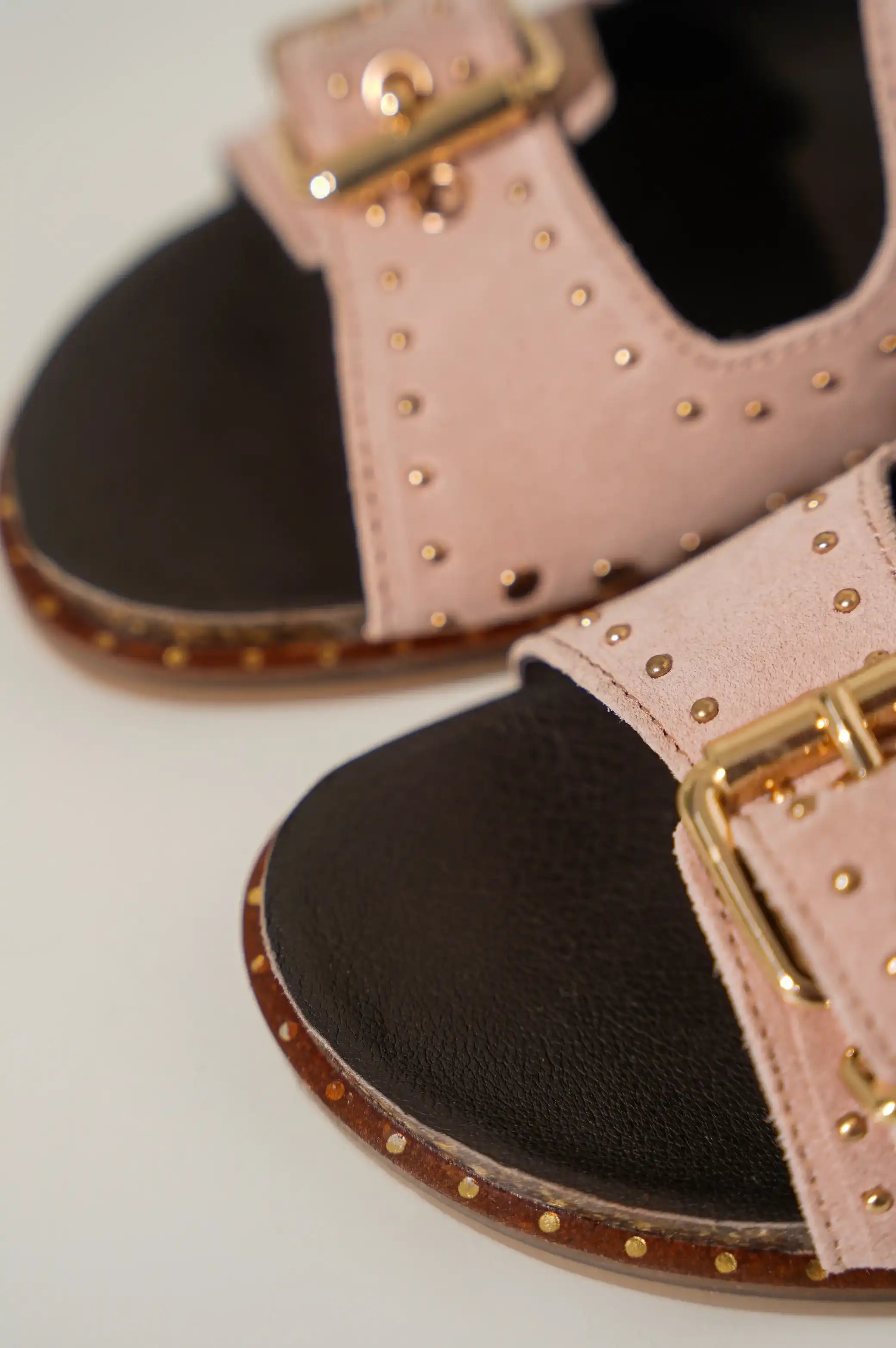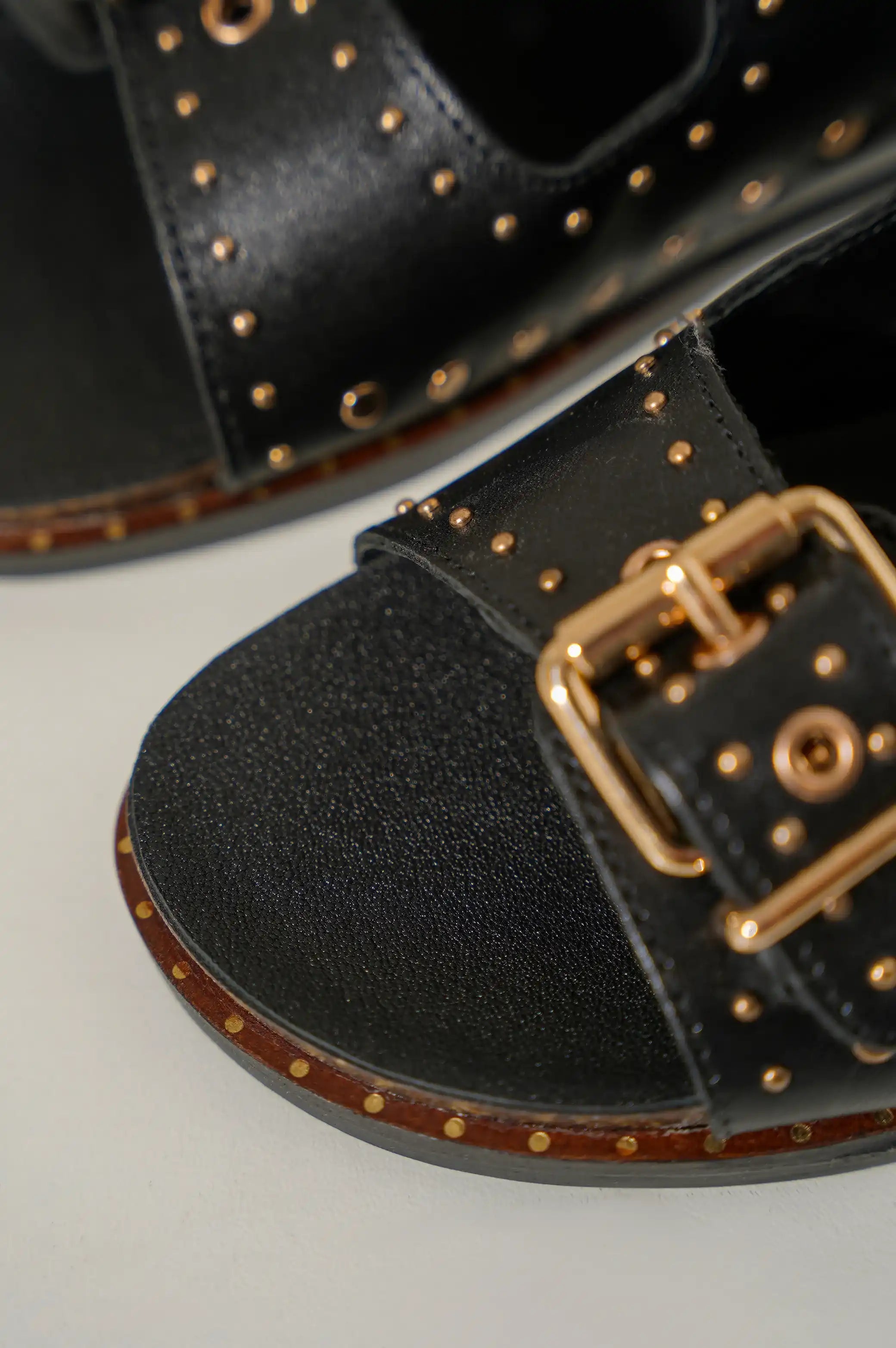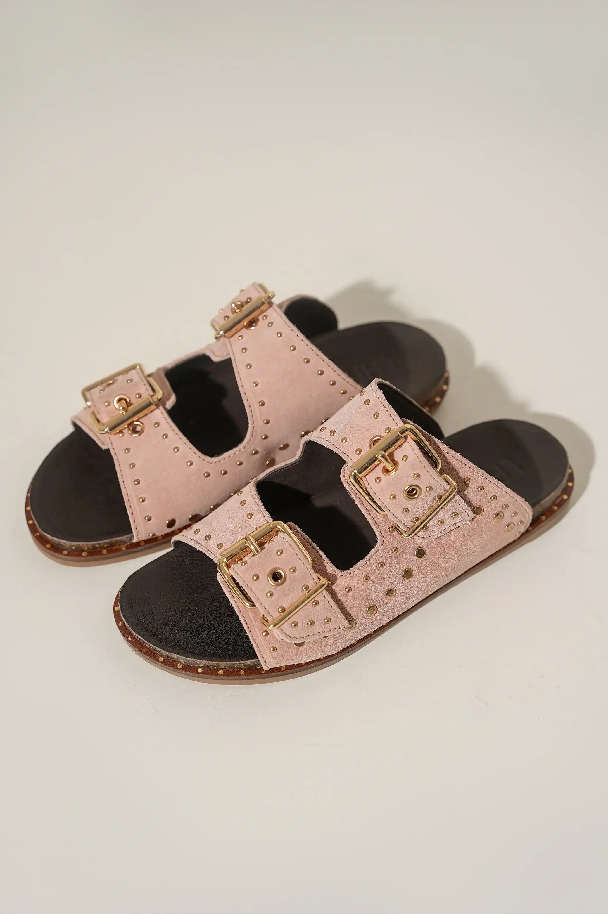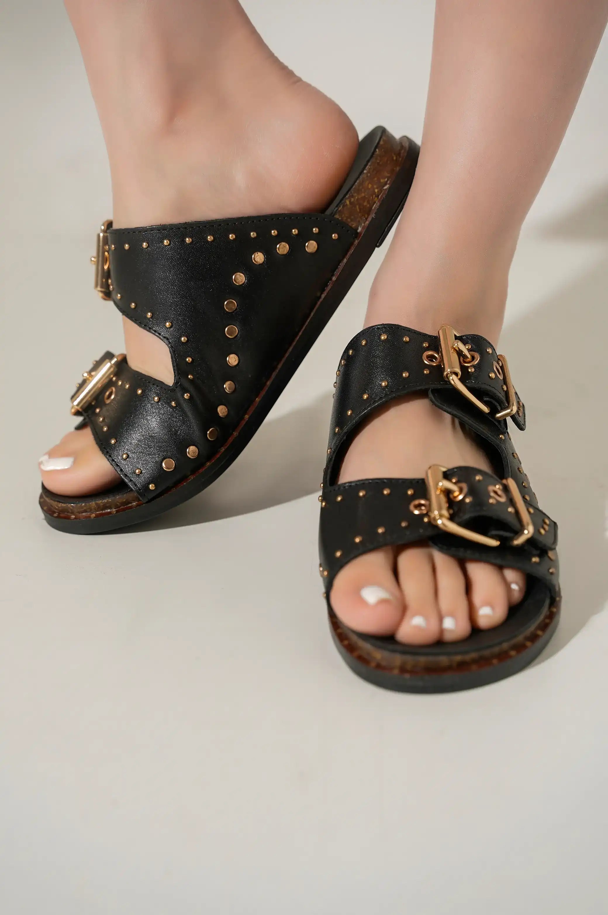 Comfy studded leather slides with double buckle.