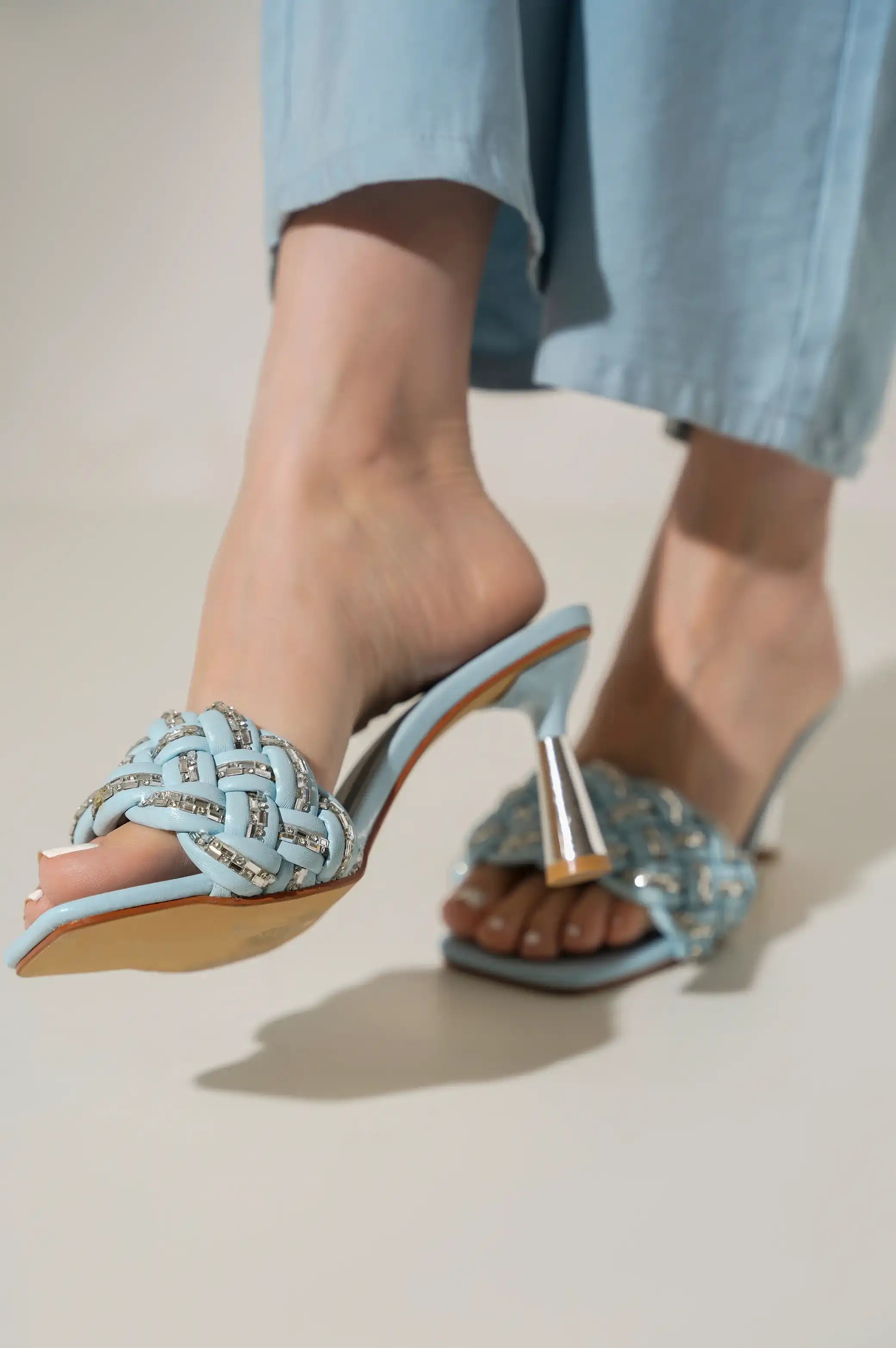 Broad diamante weave heel.- Easy fit- High heel- 2.5-inch heel-Material: Vegan leather with crystalsNote: The actual color of the product may vary slightly from the image.